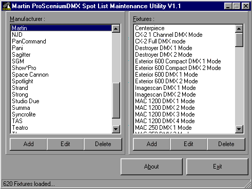 As you can see, there is a list of Manufacturers on the Left Hand Side, under these, there is the option to "Add" another or new manufacturer to the list, "Edit" the existing manufacturers name, or "Delete" the manufacturer completely along with all of the Fixture Personalities.