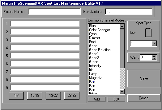 This is accessed by clicking on "Start", "Programs", "Martin ProScenium DMX", "Spot Maintenence Utility". This will open up the box that is shown below.