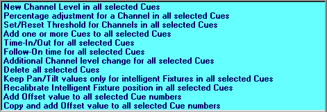 This is one of the most advanced functions of ProSceniumDMX and allows to select one or more Cues to be collectively modified. The different actions provided by ProSceniumDMX are described in the following.
